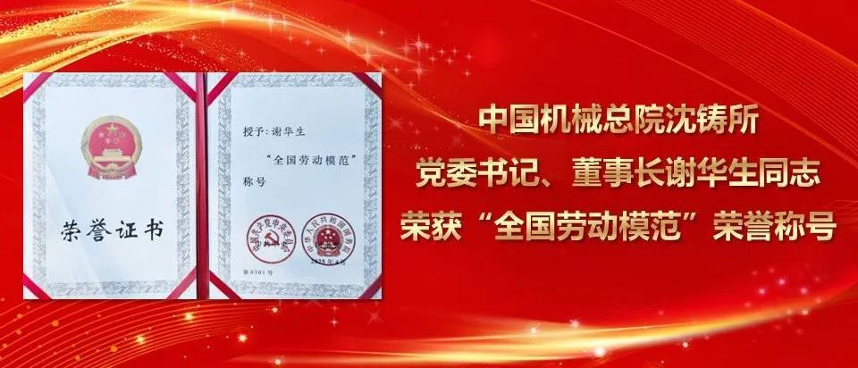 4月28日,全国劳动模范和先进工作者表彰大会在北京人民大会堂召开,中国必一体育中国总院集团沈阳铸造研究所有限公司党委书记、董事长谢华生荣获“全国劳动模范”荣誉称号。